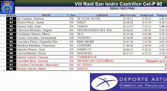 Resultados del VIII Raid de San Isidro Castrillon en Piedras Blancas (Asturias), prueba celebrada en el día de ayer 17 de Mayo de 2015. Campeonato de Asturias de Raid.